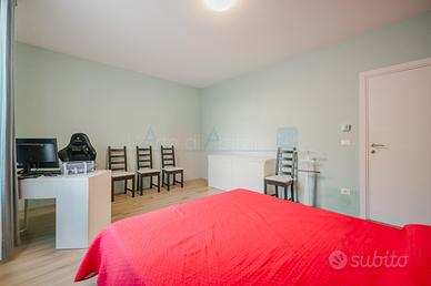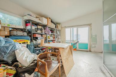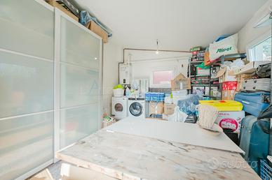 L'interno dell'abitazione si apre su un'ampia e luminosa zona giorno open space, composta da soggiorno e sala da pranzo, arricchita da una grande cucina separata con secondo accesso diretto alla veranda esterna. Dalla cucina si accede anche a un pratico magazzino e a un ripostiglio.