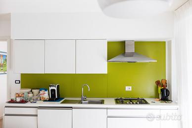 Gli interni, luminosi e curati nei dettagli, offrono ambienti accoglienti e funzionali. Il grande salone con vetrata affacciata sul giardino e camino in pietra naturale rappresenta il cuore della villa, perfetto per momenti di relax e convivialità. La cucina moderna e completamente attrezzata è dotata di lavastoviglie, forno a microonde e lavatrice, garantendo un soggiorno pratico e indipendente.