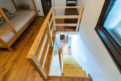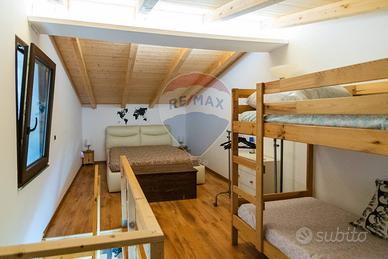 Il piano superiore, interamente realizzato in legno, ospita una camera da letto matrimoniale, un comodo letto a castello e un secondo bagno, creando unatmosfera intima, naturale e ricca di charme.