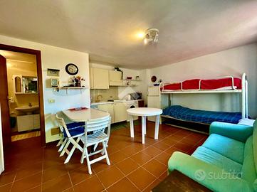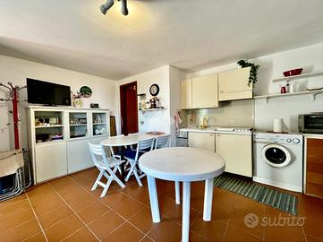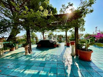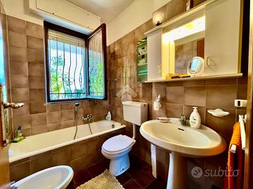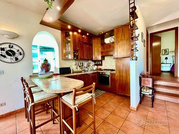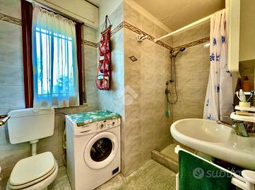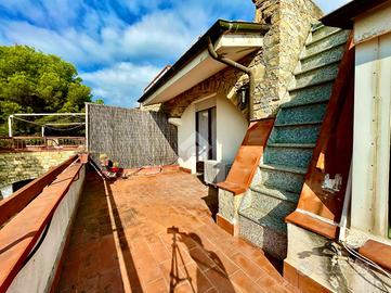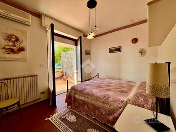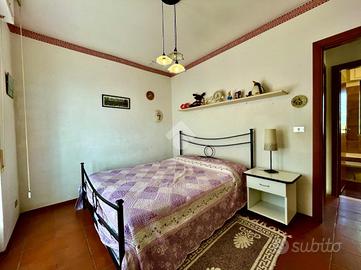 La soluzione, disposta su due livelli, è composta al piano secondo da un'ampio trilocale diviso in: ingresso su soggiorno con angolo cottura, due ampie camere matrimoniali, due bagni finestrati ed un ampio giardino in parte piastrellato con vista mare; al piano primo troviamo un comodo monolocale con spazio esterno e bagno, completamente termo autonomo rispetto al piano superiore.