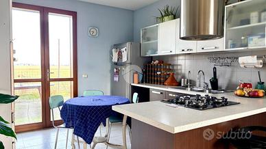 Nella zona giorno troviamo il soggiorno e la cucina open space, con due porte finestre, dal disimpegno abbiamo accesso al bagno finestrato con doccia, la lavanderia e le scale per il primo piano.