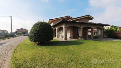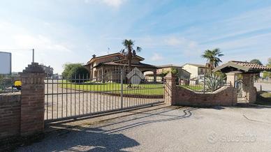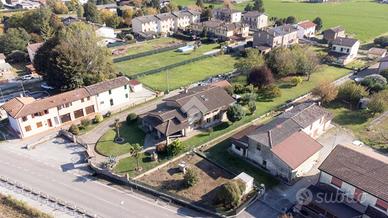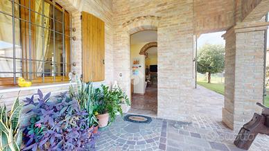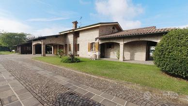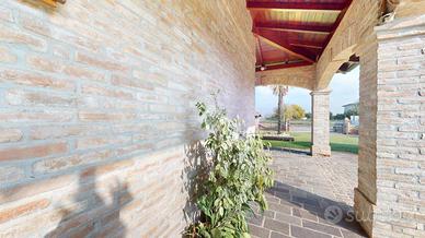 C'è un viale che curva piano, fatto di porfido e silenzio. Ti accompagna lentamente, come se volesse prepararti. Alla fine, la casa. Un corpo solido di mattoni a vista, portici profondi, travi di legno, proporzioni perfette: segni concreti di una costruzione nata per durare. Intorno, un giardino privato di circa 2.800 mq, un parco domestico che separa e protegge.