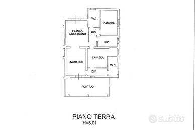 * Piano primo: appartamento con soggiorno, cucina abitabile, due camere da letto e due bagni.