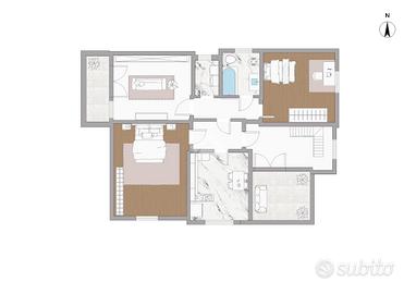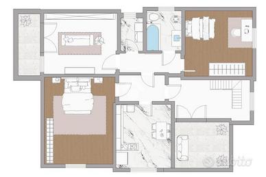 L'immobile si trova su di un lotto di 700 metri quadrati ed è così disposto : al piano terra troviamo il primo appartamento composto da grande zona giorno, cucina abitabile, due camere da letto matrimoniali, servizio finestrato e secondo locale dove si può creare un secondo servizio o una lavanderia.