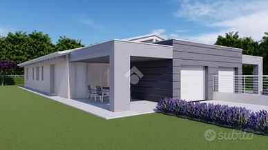 La villa si sviluppa interamente al piano terra, offrendo ambienti funzionali e ben distribuiti. L'ingresso conduce a una luminosa zona giorno open space con cucina a vista, affacciata su un ampio portico esterno ideale per momenti di relax o convivialità. La zona notte ospita tre camere da letto, di cui una matrimoniale, una doppia e una singola, oltre a due bagni finestrati, uno dei quali utilizzabile anche come pratica lavanderia.