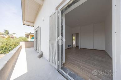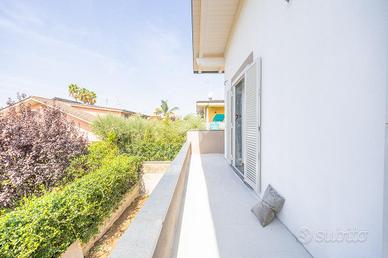 Esternamente il villino è realizzato con un ampio spazio interamente privato, contornato in parte verde ed in parte pavimentato che consente di parcheggiare comodamente due o più auto.