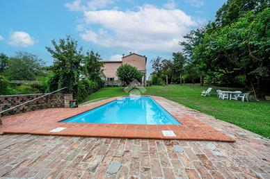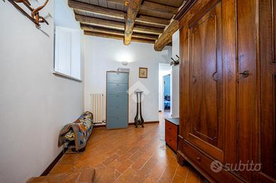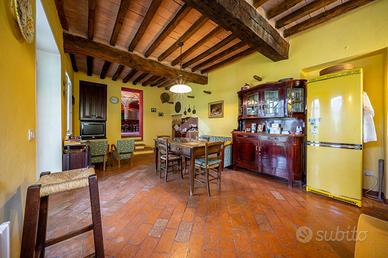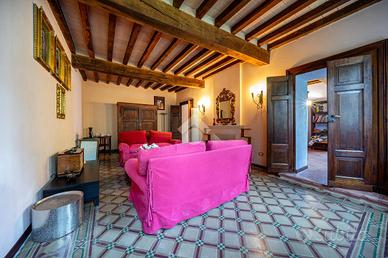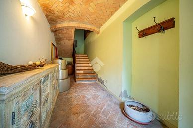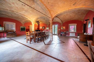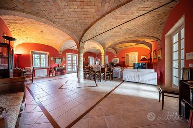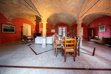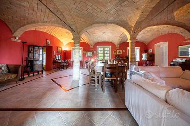 L'ingresso dell'abitazione tramite un porticato di circa 40 mq, da accesso diretto alla zona giorno, suddivisa tra ampia cucina abitabile e un soggiorno dalle generose metrature. Quest'ultimo ambiente è caratterizzaro e arrichito dalle colonne in mattone a vista e dal sollaio a volte. Il soggiorno ha poi sfogo sulla terrazza esterna e sul porticato dove vi è possibile posteggiare le auto.