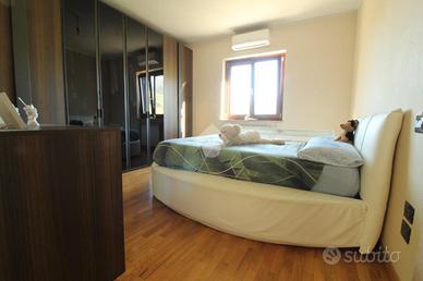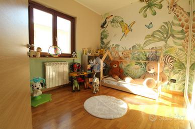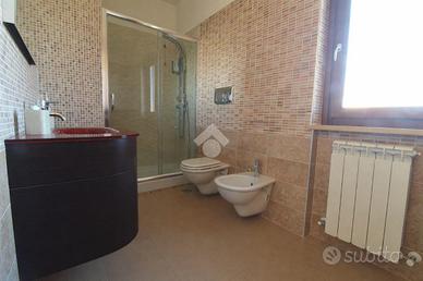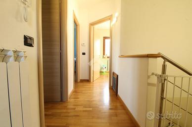 Il piano superiore è dedicato alla zona notte, con tre camere ben dimensionate e secondo bagno finestrato, rifinito con rivestimento a mosaico, box doccia e sanitari sospesi.