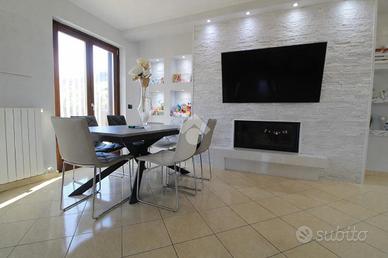 La zona giorno open space è valorizzata da camino, parete rivestita in pietra bianca quarzite e comodo ripostiglio, elementi che conferiscono funzionalità ed eleganza all'ambiente.