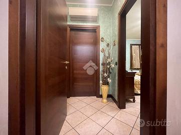 Entrando nell'appartamento troviamo subito un'ampia zona giorno, caratterizzata da una cucina abitabile fatta su misura e una zona living che unisce sala da pranzo e soggiorno tramite una splendida porta scorrevole, arricchita da vetrata caratterizzata da vetri colorati disposti in un elegante motivo floreale, che cattura la luce naturale e la diffonde in entrambe le stanze creando giochi di luce e colori per un'atmosfera elegante e ricercata.