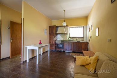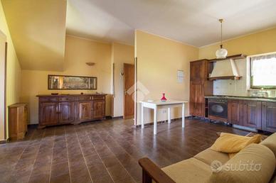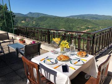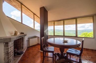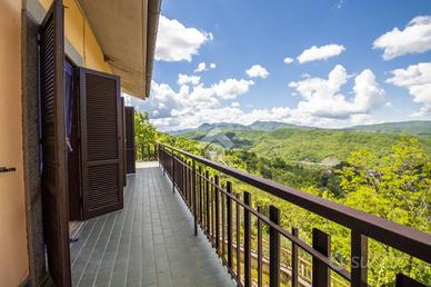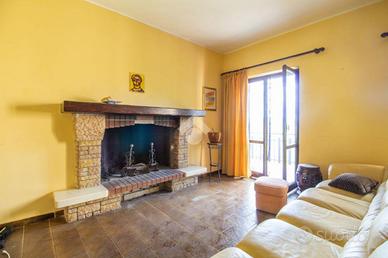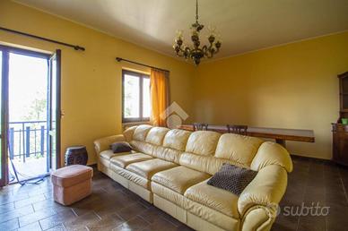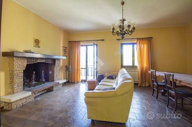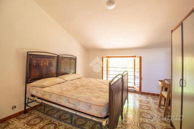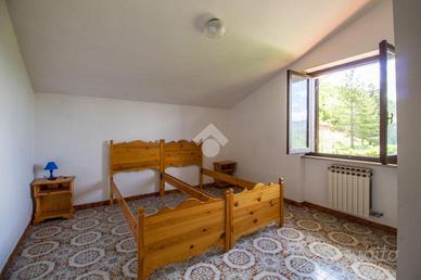 Proseguendo dalla porta principale troviamo l'ingresso, la cucina abitabile a vista, il soggiorno con camino, 1 bagno con vasca e 3 camere da letto. Tutto il piano è circondato da balcone perimetrale con vista panoramica sulla vallata.