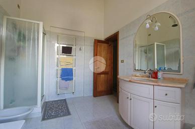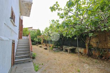 L'accesso alla villa è attraverso il portico semicircolare del piano rialzato, dove un luminoso salone con una finestratura tripartita e una cucina separata con dispensa e balcone si affacciano sul retro del giardino. La zona notte è composta da tre camere matrimoniali e due bagni, uno dei quali padronale con doccia e vasca da bagno.
