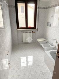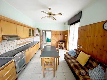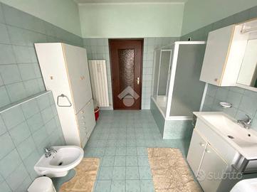 AL PIANO RIALZATO, l'appartamento di comoda metratura, di 130 mq. circa, presenta una balconata d'accesso, ed è composto da un ingresso e disimpegno, un soggiorno servito da balcone e una cucina abitabile con affaccio sulla balconata esterna. La zona notte divisa da disimpegno è composta da una camera matrimoniale con balcone, una camera doppia con balcone, un bagno completo con doccia e un secondo bagno completo con vasca attrezzato a lavanderia, entrambi ristrutturati nel 2007.