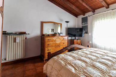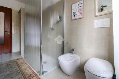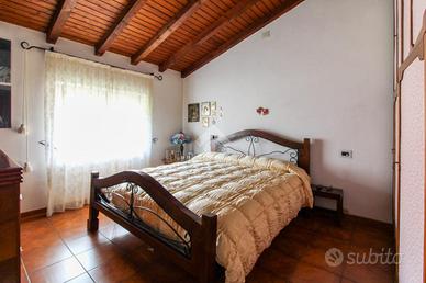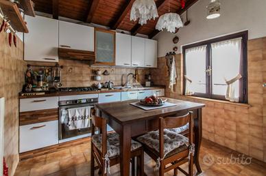 Attraverso un'altra scala esterna, situata nel porticato comunicante con il primo appartamento, si raggiunge il secondo alloggio, un trilocale posto al piano superiore. Anche qui l'ingresso si apre su un piccolo corridoio che collega i vari ambienti: due camere matrimoniali, di cui una arricchita da una cabina armadio, un bagno finestrato con vasca, una cucina separata e un soggiorno estremamente luminoso grazie ai lucernari, impreziosito da un caminetto che dona calore e atmosfera. Dal corridoio, una scaletta sale verso un piccolo soppalco, ideale come studio privato o angolo dedicato alla lettura e al relax.