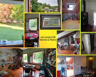 Vendo porzione di Villa Bifamiliare a Monte San Pietro, in posizione stupenda a 4 minuti di auto dai servizi (Calderino) e 10/15 da Casalecchio/Bologna; allo stesso tempo è immersa nel verde e nella natura, ottimamente collegata da Strada Provinciale. Ha una superficie complessiva di 360 mq commerciali su tre piani: -seminterrato: 140 mq (locale caldaia/bagno-lavanderia/disimpegno/2 ampi locali di 50 mq ciascuno con predisposizione cucina) allo stato di grezzo avanzato (impianti riscaldamento/idraulici/elettrico/ scarichi rifatti); -piano terra: 120 mq con 2 porte di accesso e possibilità di doppia abitazione/residenza (2 cucine/1 bagno/disimpegno/2 locali/portico); -1° piano mansardato di 100 mq (3 camere da letto/ampio locale-salone/predisposizione per un bagno) e 500 mq di area cortiliva di cui: -100 mq parcheggio, appena realizzato, con accesso da strada privata; -400 mq di stupendo giardino. La porzione di bi-familiare è perfettamente separata dalla porzione attigua, con la quale non condivide nessuno spazio. La casa è in fase di parziale ristrutturazione (sono state sostituite quasi tutte le porte/finestre- sono state fatte le predisposizioni per un car-port (con pannelli solari) di 25 mq e per pannelli solari sul tetto ... ) con possibilità di intervenire in variante sulla scia, per personalizzare gli spazi. Vi è ancora margine, sfruttabile, per la detrazione al 50% sulle ristrutturazioni (compiute prima del rogito) che potrei scalare dal costo (detraendo questa somma nei prossimi 10 anni); il prezzo è trattabile. E' dotata di impianto riscaldamento a biomassa (5 stelle/A+) e impianto solare per acqua sanitaria (ott.2022). Vi sono 3 canne fumarie per allestire, eventualmente, stufe a legna o pellet. La zona ha un micro-clima che rende superfluo il condizionatore dell'aria fredda ed è ben collegata ad internet (è imminente l'allaccio alla fibra veloce). No Intermediari, nessun costo di mediazione, no perditempo.