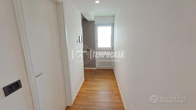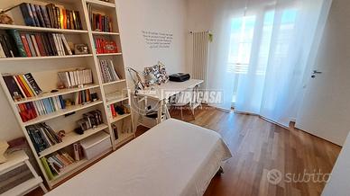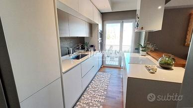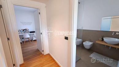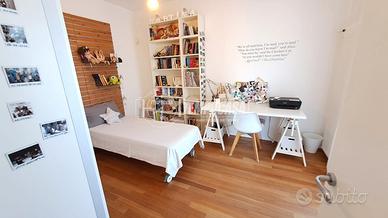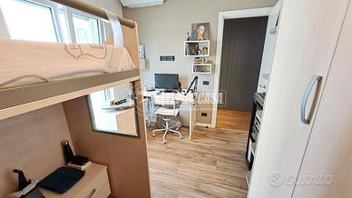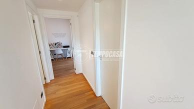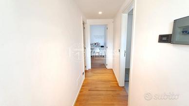 Procediamo nel disimpegno, anche questo con possibilità di chiusura con porta a scomparsa, dove troviamo la cameretta, il primo splendido bagno, l'ampia camera da letto matrimoniale con bagno privato e la seconda cameretta! L'immobile è caratterizzato da un rifinitissimo parquet enfatizzato ancor di più dalla luminosità della casa.
