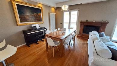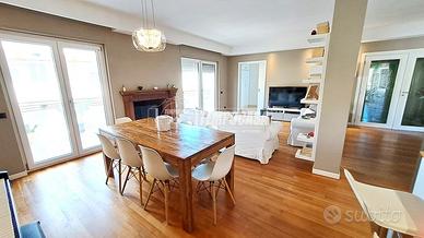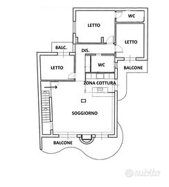 Parliamo di una soluzione bifamiliare al primo piano così disposta: ingresso su ampia e luminosa zona giorno che ti lascerà senza parole!!! Infatti l'ambiente oltre ad essere spazioso, è accogliente e curato ed è presente un caratteristico caminetto e una cucina a vista sul salone con possibilità di chiusura a scomparsa lateralmente! Di qui accediamo al primo balcone esterno!