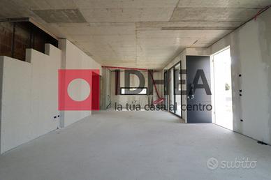 Al piano terra la zona giorno open-space di 46,42 mq. ben illuminata che affaccia sul giardino privato e splendido portico coperto, proseguendo tramite il disimpegno si raggiungono il bagno e la centrale termica.