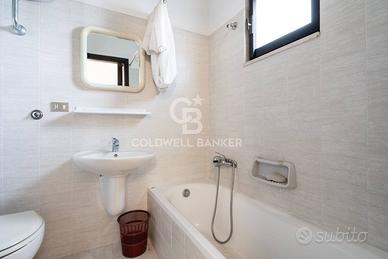 La villa dispone di un ingresso soggiorno con caminetto, bagno, comodo cucinino e due camere da letto matrimoniali con bagno in camera ristrutturato.