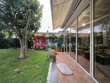 Completa la proprietà ampio magazzino al piano terra di c.a. 60 mq e giardino disposto su fronte e retro della casa.