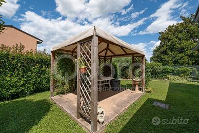 Completano la proprietà un ampio porticato, un posto auto coperto e un giardino piantumato con vialetti in betonelle che regala riservatezza e relax allaria aperta.
