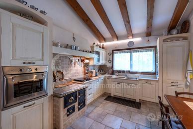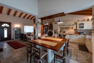 La residenza principale si sviluppa su un unico piano e accoglie con una luminosa zona giorno open space, caratterizzata da ampie vetrate, travi a vista e una cucina in muratura con spolert, ideale per chi ama la convivialità e i dettagli di pregio.