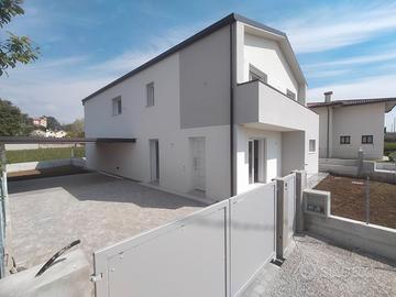 Nuova bifamiliare,al piano terra con soggiorno cucina bagno lavanderia ripostiglio sottoscala,al primo piano tre camere e un bagno,soffitta accessibile con scaletta retrattile per uso ripostiglio,terrazzo di 10 mq. Due posti auto coperti e giardino.Fotovoltaico di 6 kW.pompa di calore, riscaldamento a pavimento e climatizzatore, serramenti in PVC persiane in alluminio con comando smart , classe energetica A4 totalmente indipendente dall'altra unità..