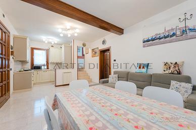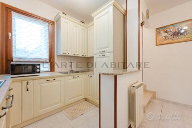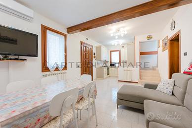PORZIONE IN VERTICALE strutturata su due piani. Si compone da ingresso, soggiorno con angolo cottura, due bagni, 2 camere e una terrazza. Soluzione in buono stato d'uso, ristrutturata negli anni 2000 con riscaldamento autonomo e caldaia cambiata nel 2021. sono presenti i serramenti in legno con vetrocamera, portoncino blindato e due split dell'aria condizionata con pompa di calore. Nel 2025 è stato rifatto il tetto e la facciata esterna. Si completa con un garage/magazzino privato.