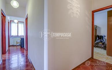 Il piano rialzato si apre su un lungo e funzionale disimpegno che conduce a tre ampie stanze, ideali come studi, camere o spazi polifunzionali, oltre a un comodo bagno di servizio con doccia e attacco lavatrice.
