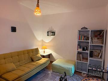 o Piano terra: ampia veranda esterna, soggiorno con angolo cottura, divano letto, libreria, bagno e stufa elettrica.
