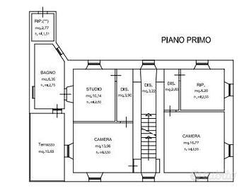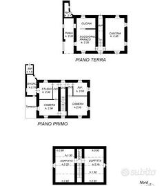 - al piano primo da due camere, studio, ripostiglio, disimpegni e bagno;