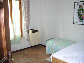 Libera su 3 lati - corte comune e due corti indipendenti, con box auto, 200 mq di orto recintato, possibilità recupero vano cantina in piano interrato più volume esterno di 20 mq; inoltre possibile estensione striscia di terreno agricolo accorpato alla casa per eventuale secondo ingresso indipendente..Composta da P.T. Salai/Ingresso, soggiorno con camino, cucinotto; P.1° camera matrimoniale + ripostiglio, ulteriore camera con due letti/matrimoniale, Bagno .