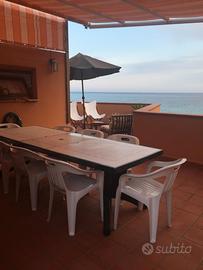Vendesi casa fronte mare, in condominio con posto auto. La casa è completamente arredata. Vista panoramica, mozzafiato. Su 2 livelli. Al 1.piano salone, cucina, balcone, camera matrimoniale, 2 camerette, bagno. Terrazzo sovrastante con mansardina e barbecue