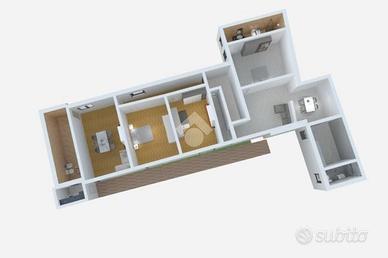 L'altra unità presenta un primo ambiente, con finestra ampia, che fa accedere a sx ad una camera con bagno e tramite piccola rampa ad una saletta, da qui entriamo nella cucina con finestra e al secondo bagno.