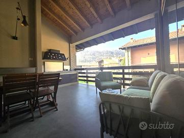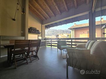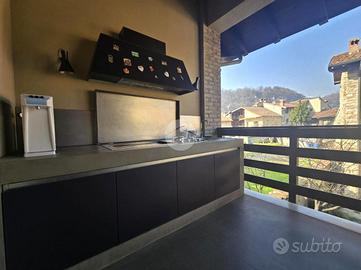 Passando poi al secondo e ultimo piano, si viene accolti da un ampio salotto con cucina open space con accesso all'esclusiva terrazza privata, dotata di cucina esterna alimentata da impianto a gas, e tenda elettrica, in grado di garantire maggiore privacy ed un isolamento termico anche nei mesi più freddi.