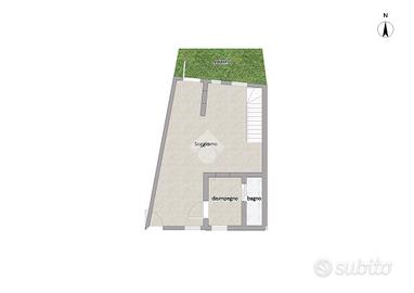 Al piano terra, l'ingresso conduce ad una zona giorno che conta un soggiorno open space con cucina a vista, ed un disimpegno finestrato che introduce ad un primo servizio cieco. Il piano terra affaccia su uno spazio esterno privato.