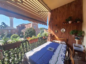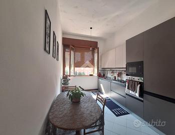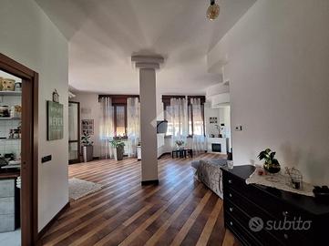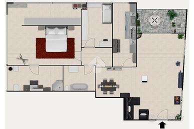 L'ingresso è nell'ampio e moderno soggiorno luminoso, grazie alla doppia esposizione e all'affaccio su terrazzino sfruttabile, ideale per momenti di relax all'aperto, la cucina è abitabile.