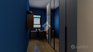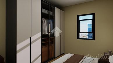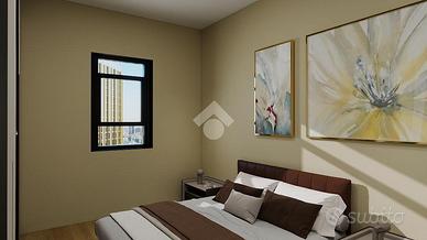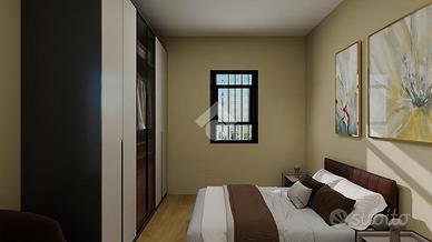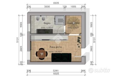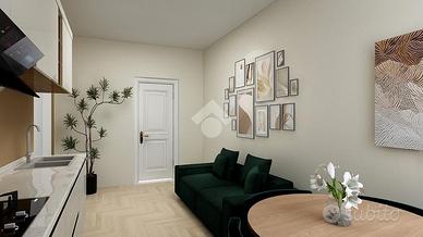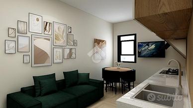 L'ingresso si apre sulla zona giorno, composta da soggiorno con cucina a vista; a seguire un piccolo disimpegno ed un bagno finestrato.