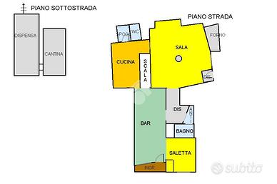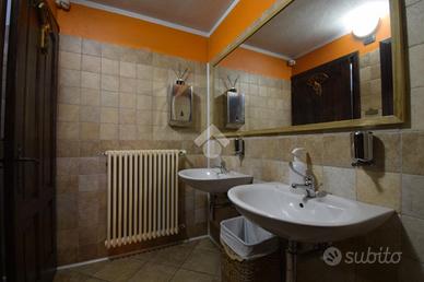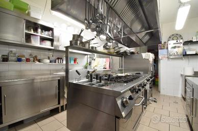 La cucina, di circa 20 mq, è attrezzata con postazione di cottura centrale e dispone di uno spogliatoio con w.c. dedicato. Dalla cucina si può accedere tramite alla spaziosa cantina al piano interrato, ove è ubicata la dispensa e una cantina. La comoda scala in pietra collega il piano bar alla zona reception dell'albergo. Quest'ultima è dotata di accesso indipendente dal retro del locale e funge anche da disimpegno tra la zona alberghiera, la seconda sala ristorante e i bagni per i clienti.