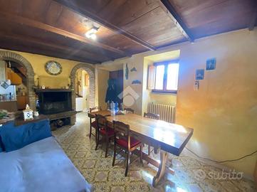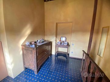 Il casale si sviluppa su tre livelli e conserva il fascino autentico delle dimore storiche, con caratteristici pavimenti in piastrelle umbre, travi a vista e un magnifico camino antico a doppia faccia. Gli spazi interni sono così composti: cucina, soggiorno, due camere da letto, disimpegni e bagno con box doccia.
