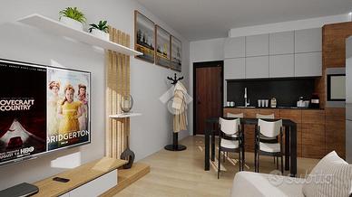 L'ingresso al piano terra si apre sul soggiorno con angolo cottura, ambiente accogliente e ben organizzato, ideale per vivere la quotidianità e per momenti di convivialità.