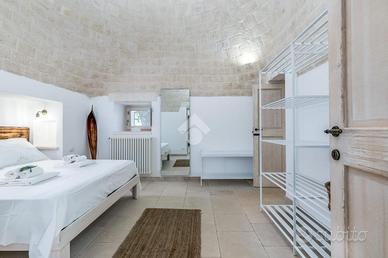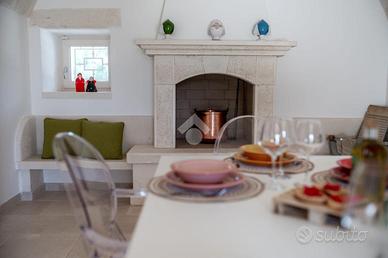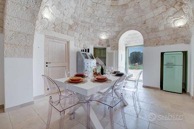 Il trullo si apre su due grandi zone giorno indipendenti, entrambe dotate di cucina privata, perfette per ospitare più nuclei familiari o per un'eventuale attività ricettiva. Completano l'abitazione quattro comode camere da letto e tre bagni finestrati, tutti con box doccia e finiture di pregio. Tutti gli ambienti sono impreziositi da pavimentazione in pietra.