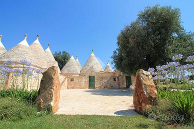 INCANTEVOLE GRUPPO DI TRULLI A 9 CONI, RISTRUTTURATO CON PISCINA E JACUZZI: Immerso nella quiete della campagna ostunese, in una delle zone più richieste e circondata da altre abitazioni ristrutturate con gusto e rispetto per la tradizione, proponiamo in vendita un maestoso complesso di trulli a 9 coni, dal fascino autentico e dalla metratura comoda e funzionale. Completamente ristrutturato nel pieno rispetto dell'architettura locale, il complesso conserva intatte le sue caratteristiche originarie: Chianche originali riportate alla luce, pietra viva sapientemente valorizzata, coni imponenti che raccontano la storia di un territorio unico. L'ingresso alla proprietà è anticipato da un elegante cancello che apre su un lungo e suggestivo viale, che conduce alla zona parcheggio e all'ampio piazzale dove si sviluppano gli spazi esterni: una splendida piscina a sfioro su due lati (circa 40 mq), una rilassante jacuzzi, una cucina esterna completamente attrezzata con tutti i comfort moderni con zona barbecue, ideale per vivere momenti di convivialità all'aperto in ogni stagione. Il trullo si apre su due grandi zone giorno indipendenti, entrambe dotate di cucina privata, perfette per ospitare più nuclei familiari o per un'eventuale attività ricettiva. Completano l'abitazione quattro comode camere da letto e tre bagni finestrati, tutti con box doccia e finiture di pregio. Tutti gli ambienti sono impreziositi da pavimentazione in pietra. Il benessere è assicurato da impianti di ultima generazione: condizionatori a pompa di calore, riscaldamento con termo arredi a GPL, pannelli solari, fossa Imhoff, due cisterne - una per la raccolta di acqua meteorica, l'altra per acqua potabile con impianto di depurazione. Il tutto è incorniciato da un meraviglioso terreno di circa 9.000 mq, piantumato con ulivi secolari, macchia mediterranea, piante sempreverdi, un grazioso orticello e un curato giardino con prato, che rendono l'ambiente esterno non solo un'estensione naturale dell'abit