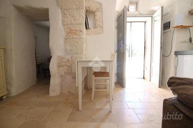 All'interno, il trullo accoglie con un'atmosfera calda e caratteristica: la sala principale, con le sue volte in pietra, funge da soggiorno e ospita in alcova un delizioso angolo cottura. Un disimpegno conduce poi alla camera da letto e al bagno con doccia, il tutto rifinito con gusto nel rispetto della tradizione locale.