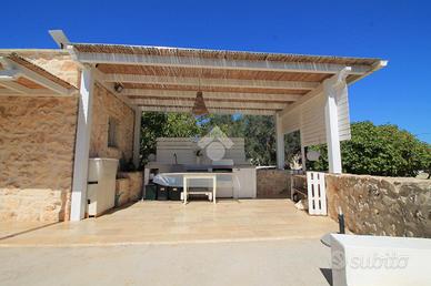 Gli spazi esterni sono pensati per vivere appieno le giornate di sole: un pergolato ospita una cucina all'aperto ideale per pranzi e cene conviviali, un comodo wc esterno con doccia e un deposito attrezzi. La piscina fuori terra, in legno, è incorniciata dal verde, regalando freschezza e relax durante le calde estati pugliesi.