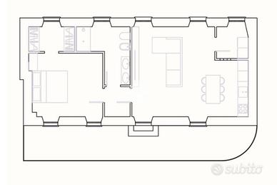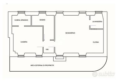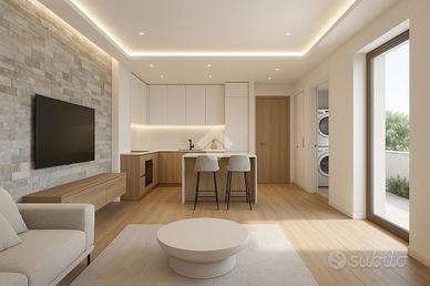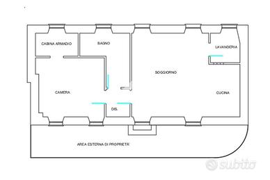 L'abitazione è suddivisa in ampia zona giorno con cucina a vista ed angolo lavanderia, dal quale si accede all'area esterna di proprietà. Tramite il disimpegno si accede al bagno con doccia e alla camera matrimoniale con cabina armadio finestrata.