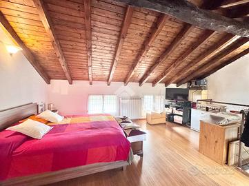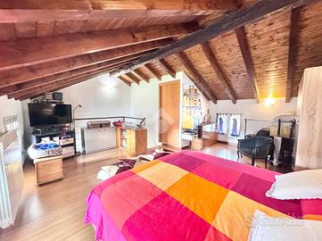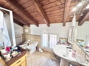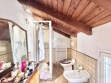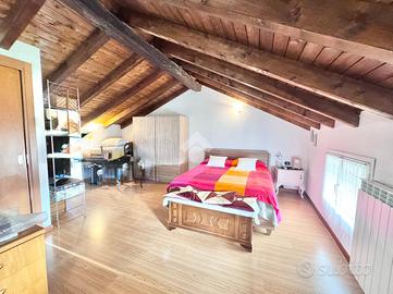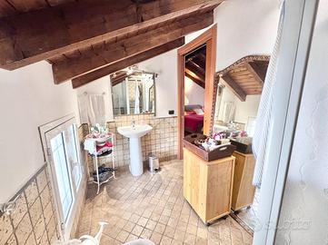 Salendo la scala interna, si accede alla zona più intima e suggestiva della casa: una splendida camera matrimoniale mansardata. Qui il parquet e le imponenti travi del tetto creano un'atmosfera sospesa e rilassante, tipica degli chalet di montagna ma nel cuore del paese. A servizio esclusivo del piano superiore troviamo il secondo bagno, un ambiente riservato e completo di un moderno box doccia.