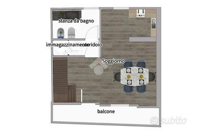 Varcata la soglia al primo piano, si viene subito colpiti dal soffitto in legno che sovrasta la zona giorno con cucina a vista, un ambiente conviviale e funzionale che invita alla condivisione. Un pratico disimpegno conduce al primo bagno della casa, finestrato e già predisposto con gli attacchi per la lavatrice, pensato per gestire la quotidianità con la massima praticità.