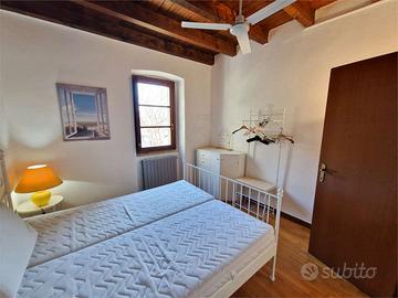 La magia continua nella mansarda, utilizzata come terza camera da letto, che accoglie due finestre velux e un bagno completo in stile vintage con vasca, creando un ambiente intimo e di grande fascino.