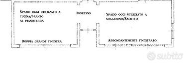 2) area al pianoterra di circa 70 mq, ex zona ufficio/spazio espositivo, ora utilizzata a zona giorno di casa privata, e quindi trasformabile;